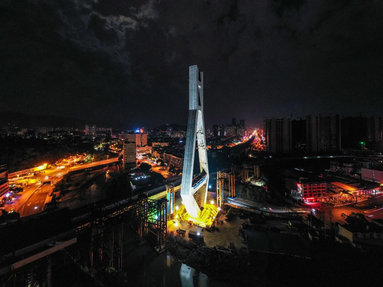 4月10日凌晨,龍巖大橋百米高萬噸主塔完成逆時針69度旋轉(zhuǎn),歷時1小時20分鐘左右安全到達指定位置。
