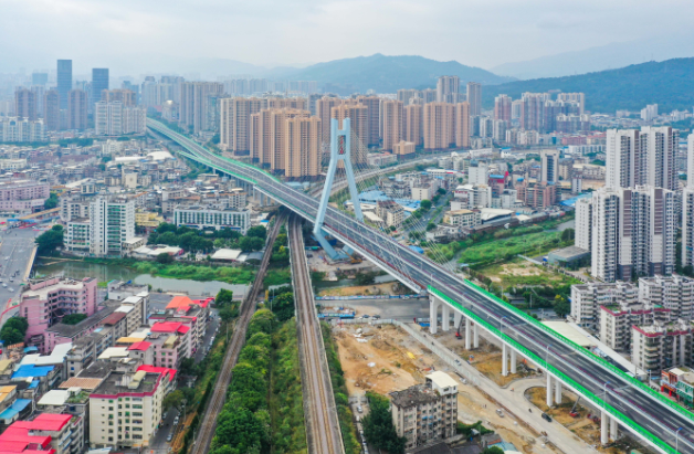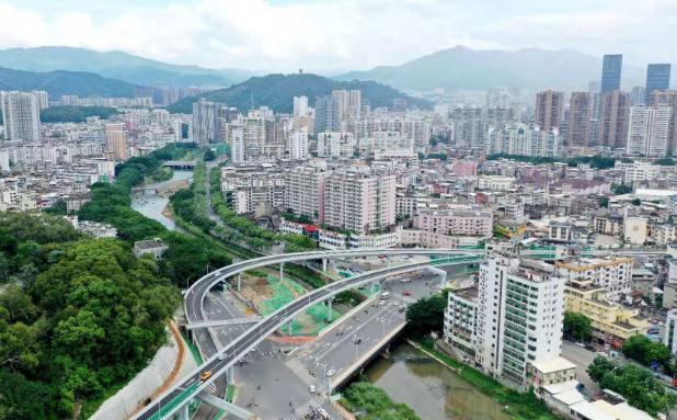 羅橋節(jié)點(diǎn)改造提升工程2019年11月開工建設(shè),2021年8月建成通車。該項(xiàng)目沿北環(huán)西路、龍興路設(shè)置南北分離式雙向四車道高架,南側(cè)接龍興路,北側(cè)接現(xiàn)狀北環(huán)西路,高架靠東側(cè)布置(緊貼烈士陵園),橋梁總長(zhǎng)約1140米,凈寬約7.7米;在雙洋路、龍川北路、北環(huán)西路設(shè)置人行天橋,與山體步道銜接,以完善慢行系統(tǒng);在烈士陵園山體下采用明挖回填方式設(shè)置框涵,長(zhǎng)度約225米,凈寬10.75米工程投資1.4億元。